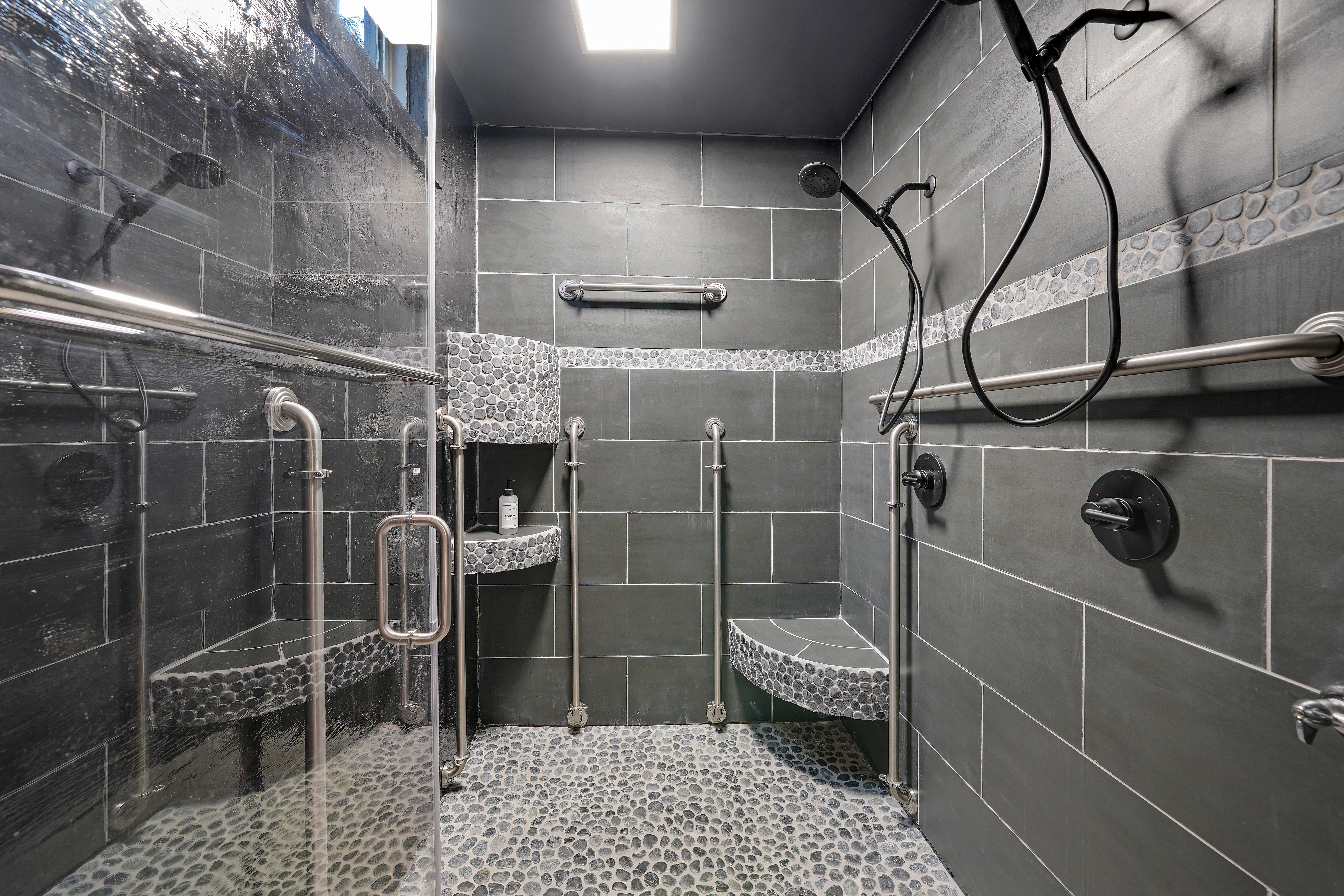 A spacious shower area with two shower heads, built-in seating, grab bars with adjustable attachment points, and a hot/cold sprayer hose.